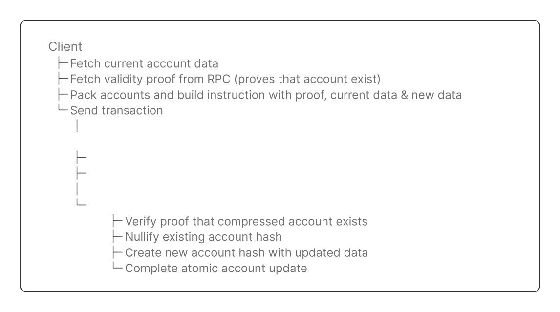 This guide will cover the components of a Solana program that updates compressed accounts.Here is the complete flow: